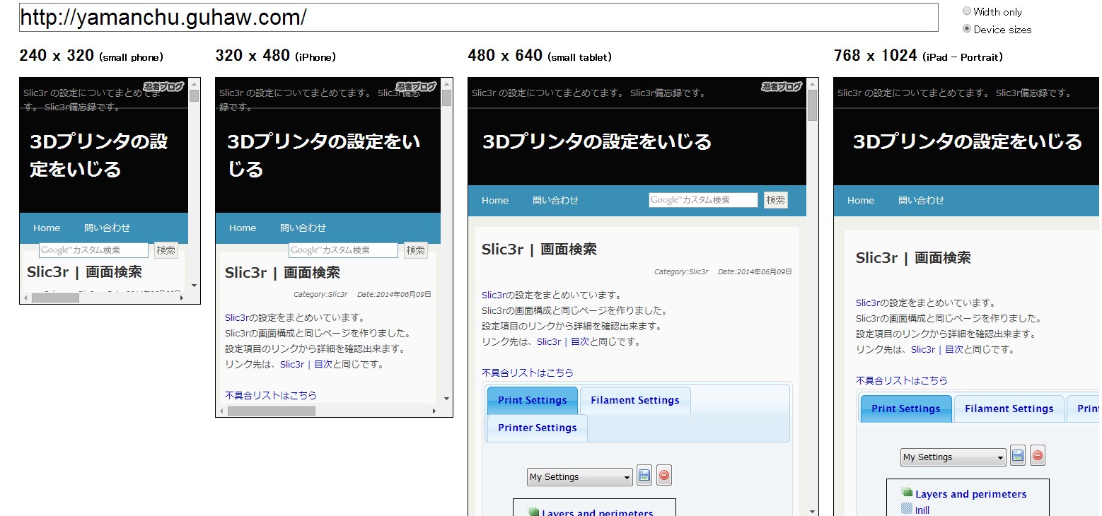 独り言 | デバイスの違い ブログを書いていて、ふと画面サイズの違いで、ちゃんと見れないんじゃないかと心配になりました。 横幅が1024pxあれば、ちゃんと収まるようにしているつもりですが、でも気になる。 調べたら、いろんなデバイスのサイズに合わせてサイトを閲覧できるページがありました。 Responsive Web Design Testing Tool このサイトに確認したいページのURLを入れると、下のようにサイズ毎に表示してくれます。いいね! このブログは、Slic3r | 画面検索のページが横幅1024px以上無いとダメでした。 見よう見まねでjavascriptで書いてみましたが、レイアウトが崩れてました。色々難しいんですね。 他のページは横幅640px以上無いと厳しいですね。 お勉強も兼ねて、色々(Web GL等)試したいのですが、基本的にノートパソコンをターゲットに考えています。