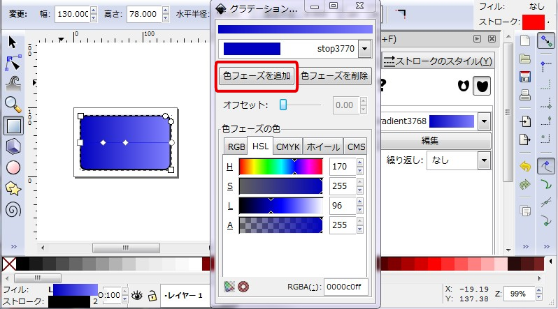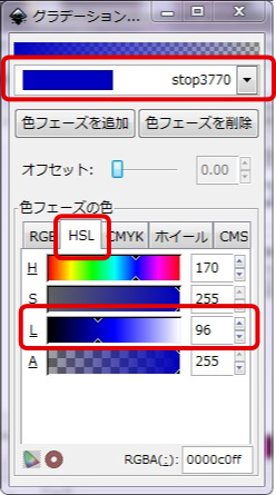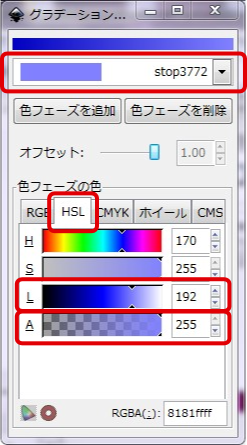 4.  コンボボックスで色の薄い方を選択してHSLタブのAを225にします。(不透明にしました)