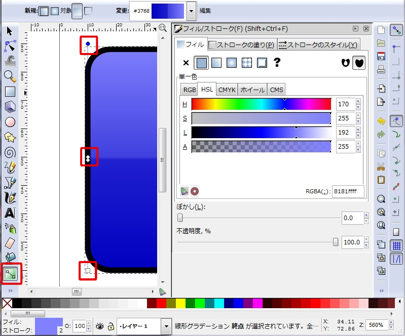 制御点が表示されていない場合はグラデーションツールを選択して、フィルを選択すると表示されます。