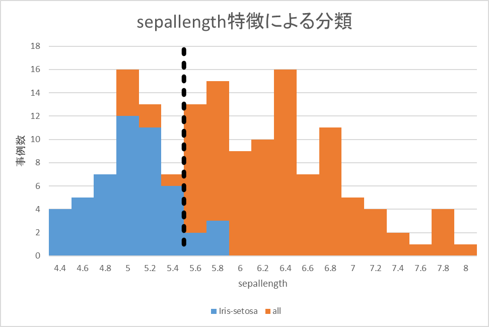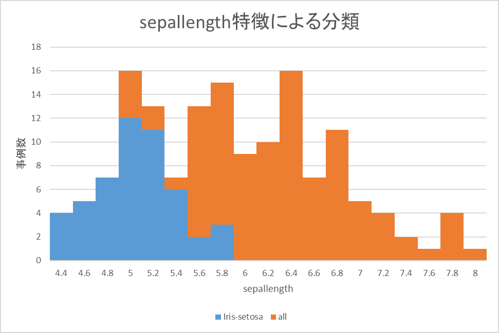 iris.arffのsepallength特徴から、Iris-setosaか否かの識別を行うものとします。
