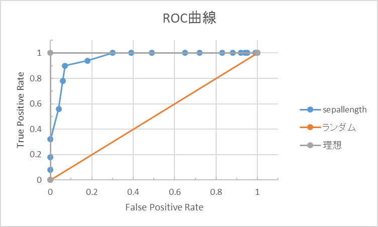 閾値を変えた際の再現率を見る為に、横軸にFalse Positive Rate 縦軸にTrue Positive Rate をとり値をプロットしたものをROC曲線と呼びます。
