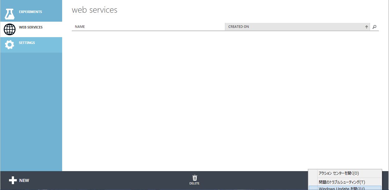 左側のメユーは「EXPERIMENTS」となっていて、これはVisualStudioの「プロジェクト」に相当するっぽい。右のビューにはおそらくプロジェクトの一覧が表示されていく模様。