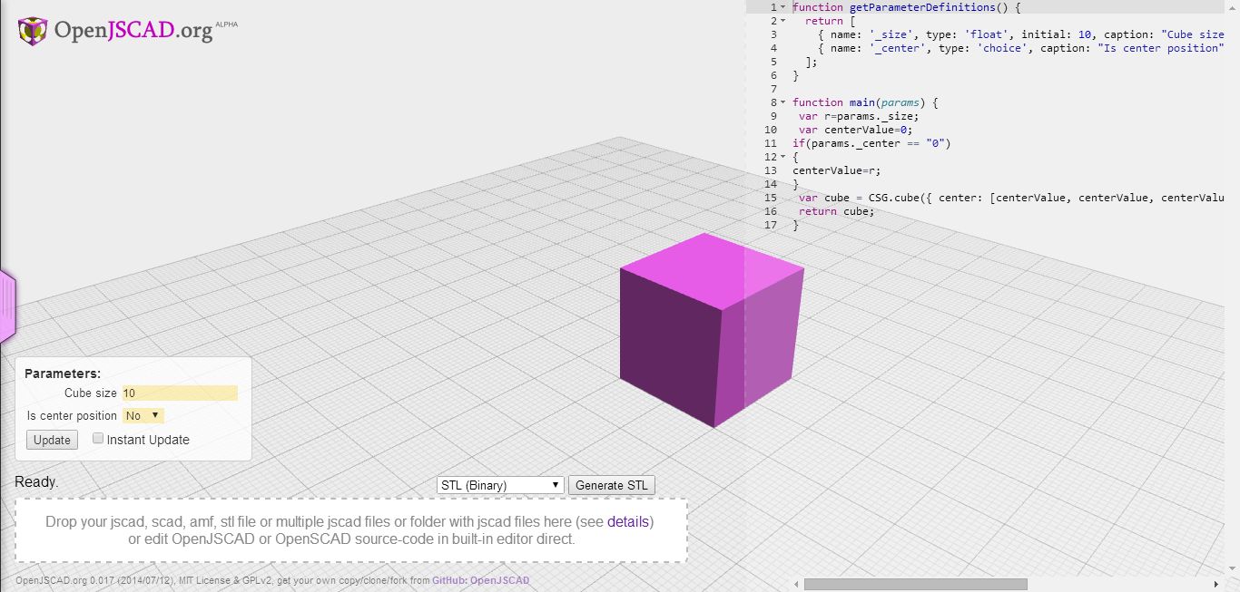 var cube = CSG.cube({ center: [centerValue, centerValue, centerValue], radius: [r,r,r]});