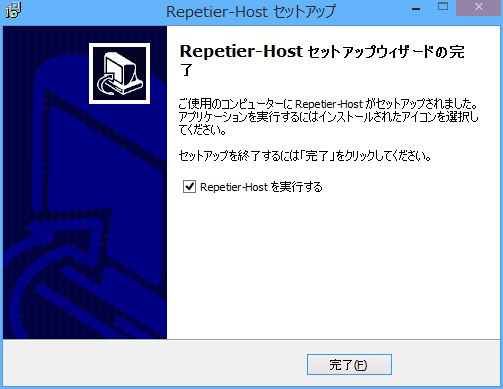 Repetier-Hostを実行するにチェック✔が入っていると、「完了(F)」ボタンを押した後、Repetier-Hostが立ち上がります。