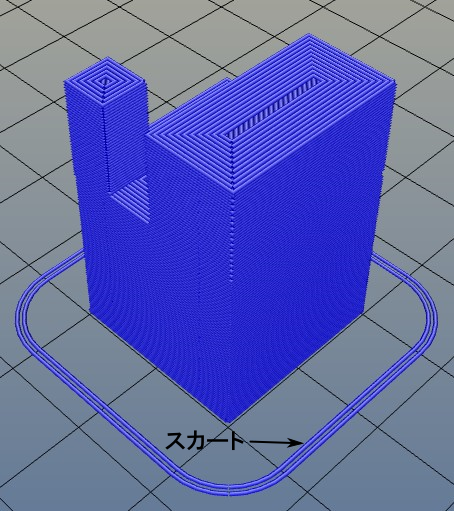 造形をスタートすると、直ぐにフィラメントが出て来ない場合が有ります。スカートを出力させて、造形時に確実にフィラメントが出るようにします。