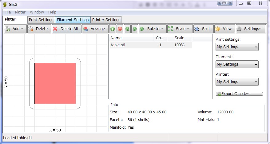 Slic3rをRepetier-Hostからではなく、直接起動すると、Platerタブが表示されます。
