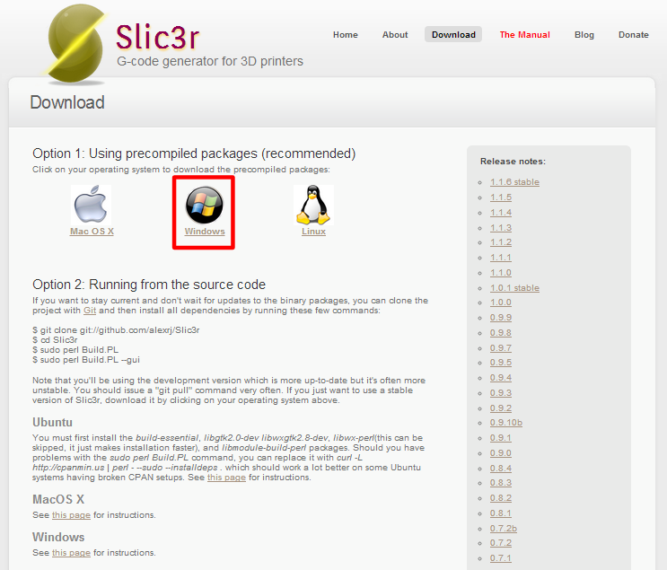 Windows版のバージョン1.0.1をインストールしたいので、Slic3rのダウンロードページに移動し、下の画面の[Windows]を選択します。