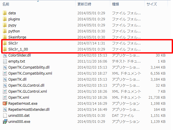 フォルダ名を変更したC:\Program Files\Repetier-Host\Slic3r_1_00は消しても平気ですが、戻せるようにそのままにしています。