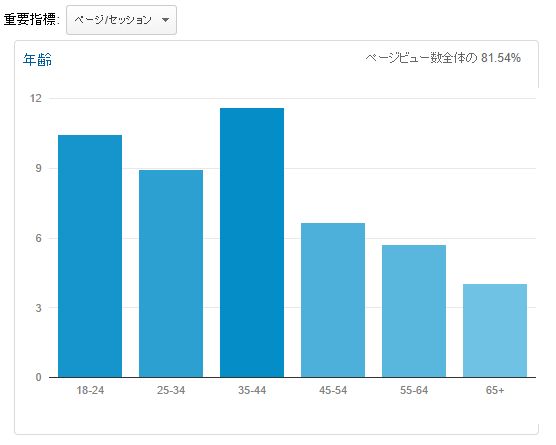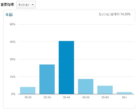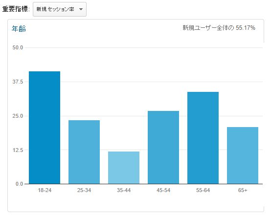35-44の新規セッション率が少ないのは、35-44のセッションが大きいからで、新規セッション数に直すと、35-44が一番多くなるんじゃないでしょうか。