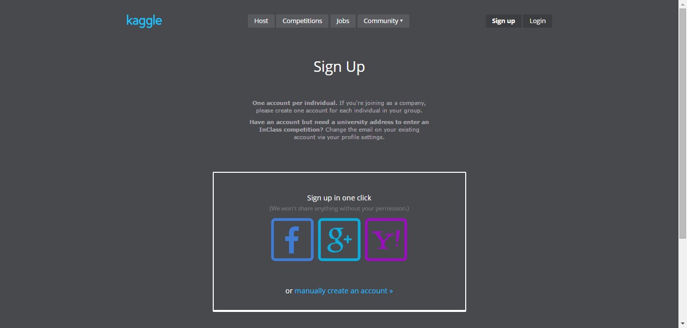 アカウントの登録画面が表示されます。わたしはGoogleのアカウントを利用してkaggleに登録しました。