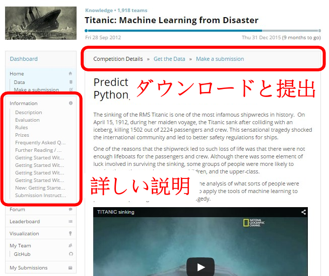 Titanic: Machine Learning from Disasteを選択すると次のような画面が表示されます。