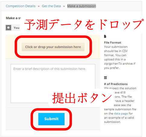 機械学習するにあたってデータの詳しい説明というのは非常重要だと思うのですが、とにかく参加する事を最優先として、予測データの提出手順を説明します。