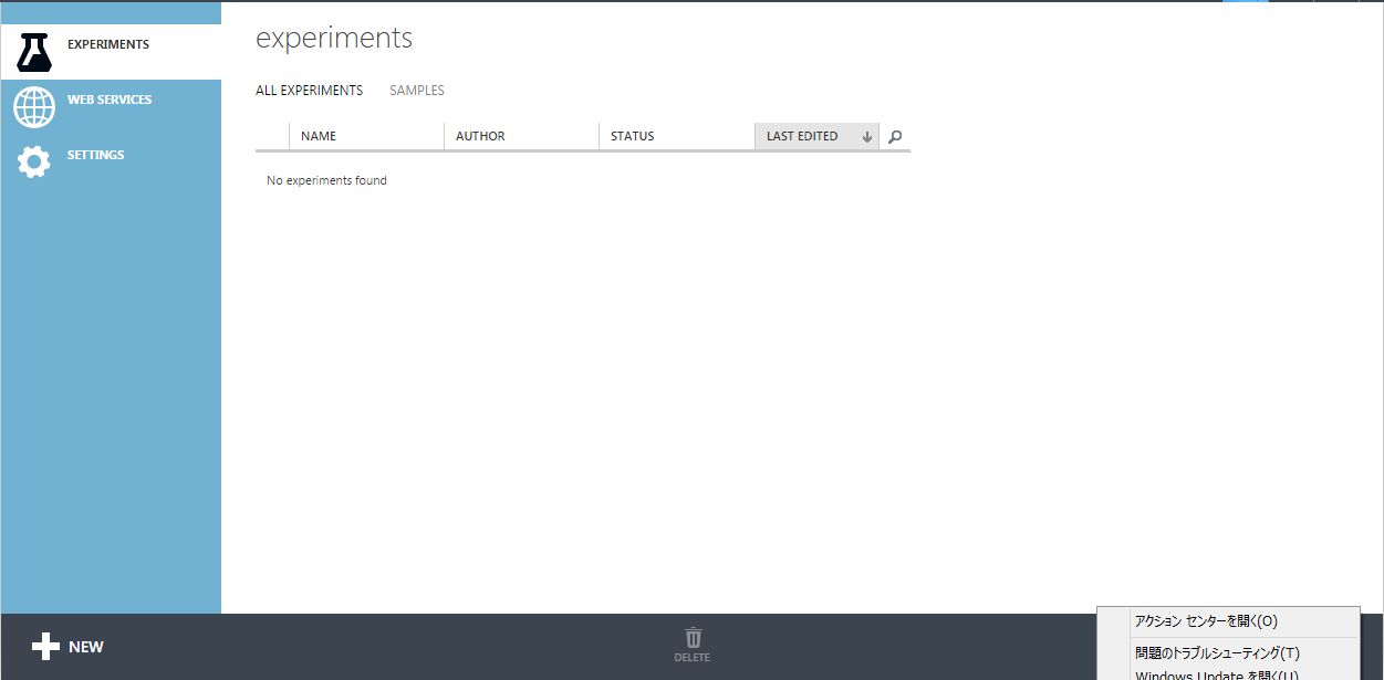 左側のメユーは「EXPERIMENTS」となっていて、これはVisualStudioの「プロジェクト」に相当するっぽい。右のビューにはおそらくプロジェクトの一覧が表示されていく模様。