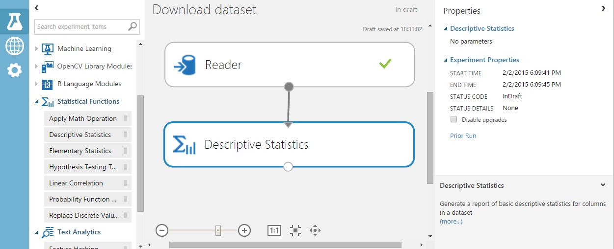 Statistical Functions > Descriptive Statistics をキャンバスに配置し、 Readerの出力ポートに接続する。