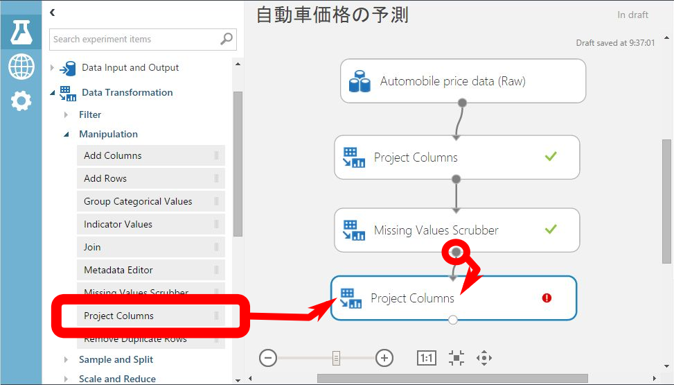 1.新しく「Project Columns」をキャンバスにセットし、「Missing Values Scrubber」の出力ポートと接続する。