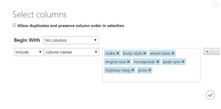 [Include] [column names] [make][ody-style][wheel-base][engine-size][horsepower][peak-rpm][highway-mpg][price]