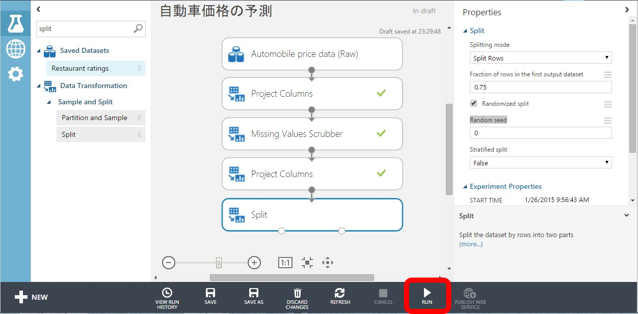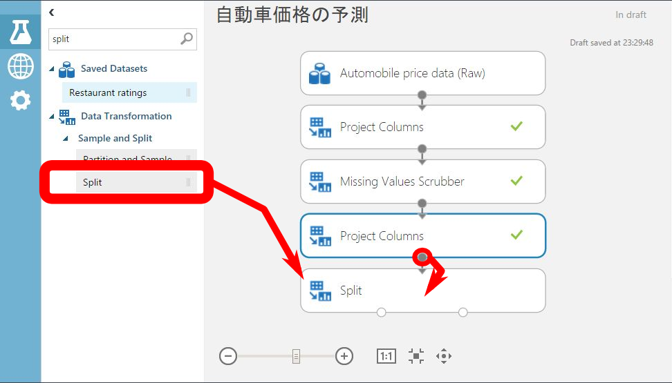 Data TransFormation > Sample and Split > Split をキャンバスにドラッグして、 Project Columnsの出力ポートと接続します。