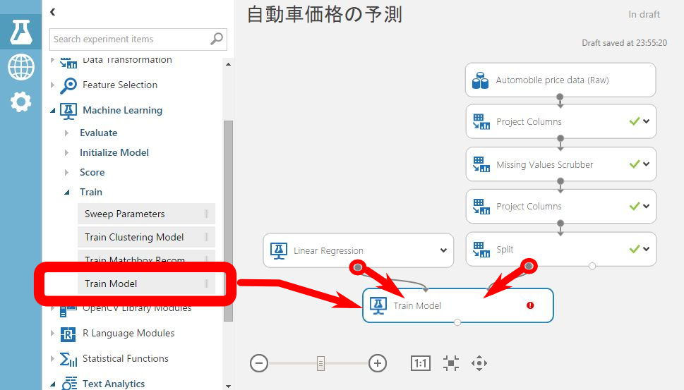 Machine Learning > Train> Train Model をキャンバスにドラッグし、Splitと、Linear Regressionの出力ポートと接続します。