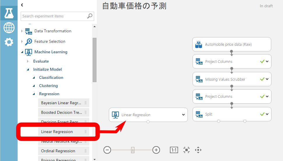 Machine Learning > Initialize Model > Regression > Linear Regression をキャンバスにドラッグします。