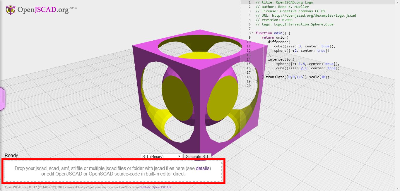 このファイルをOpen JSCADページの下の図の部分にドロップします。