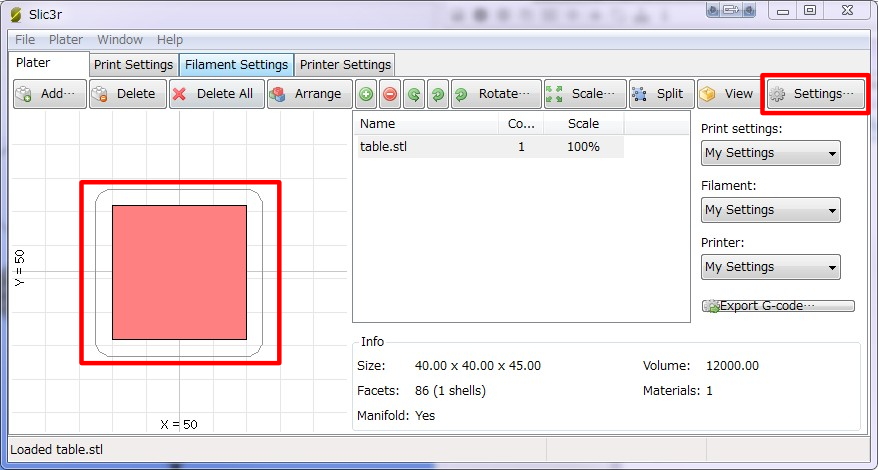 (私が直接Slic3rを立ち上げた際にウィンドウサイズの問題でSettingsボタンがちょうど見えなくなっていました。ボタンが見つからない方は最大化してみて下さい。)